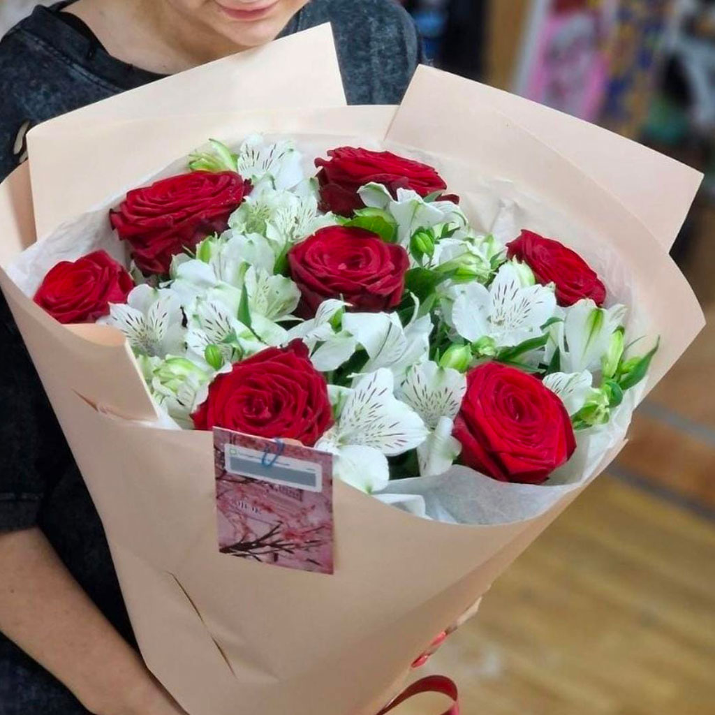 На фото представлен возможный вариант сборки. Декоративное и цветовое оформление может меняться в зависимости от наличия цветов и упаковочных материалов. Мы соберем максимально похожую композицию с использованием сезонных цветов и декоративно-цветового оформления.