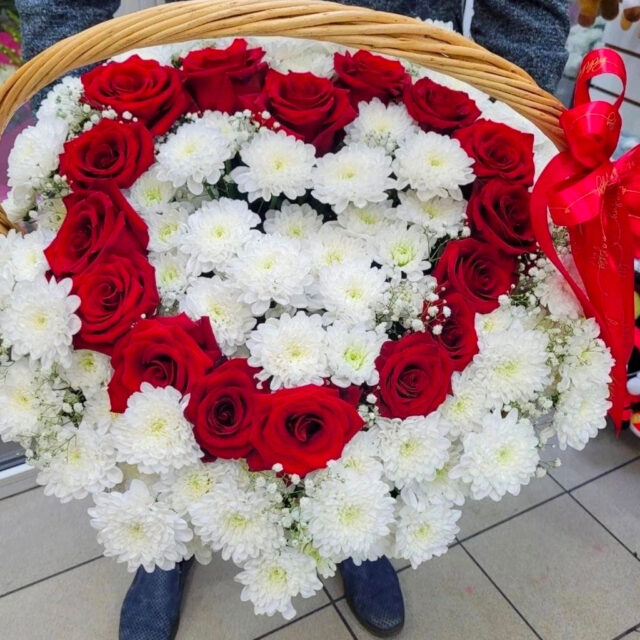 На фото представлен возможный вариант сборки. Декоративное и цветовое оформление может меняться в зависимости от наличия цветов и упаковочных материалов. Мы соберем максимально похожую композицию с использованием сезонных цветов и декоративно-цветового оформления.