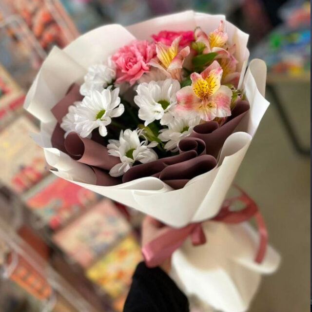 На фото представлен возможный вариант сборки. Декоративное и цветовое оформление может меняться в зависимости от наличия цветов и упаковочных материалов. Мы соберем максимально похожую композицию с использованием сезонных цветов и декоративно-цветового оформления.