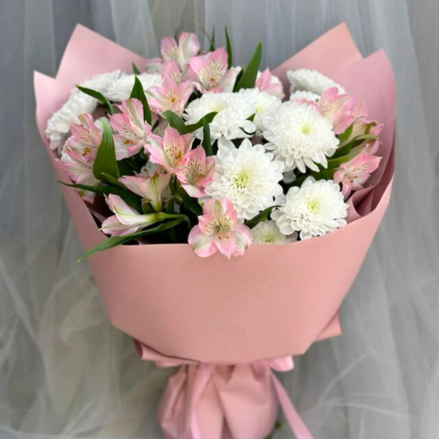 На фото представлен возможный вариант сборки. Декоративное и цветовое оформление может меняться в зависимости от наличия цветов и упаковочных материалов. Мы соберем максимально похожую композицию с использованием сезонных цветов и декоративно-цветового оформления.