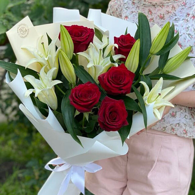На фото представлен возможный вариант сборки. Декоративное и цветовое оформление может меняться в зависимости от наличия цветов и упаковочных материалов. Мы соберем максимально похожую композицию с использованием сезонных цветов и декоративно-цветового оформления.