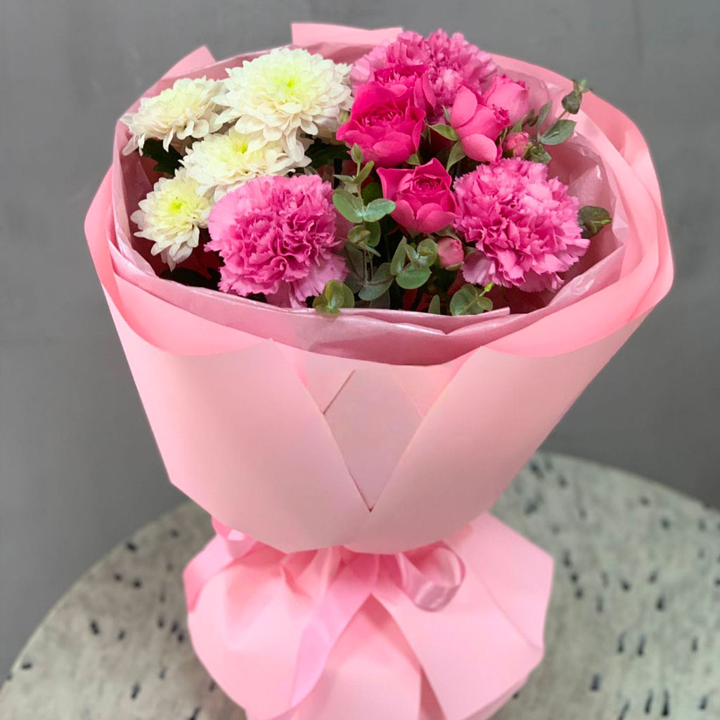 На фото представлен возможный вариант сборки. Декоративное и цветовое оформление может меняться в зависимости от наличия цветов и упаковочных материалов. Мы соберем максимально похожую композицию с использованием сезонных цветов и декоративно-цветового оформления.