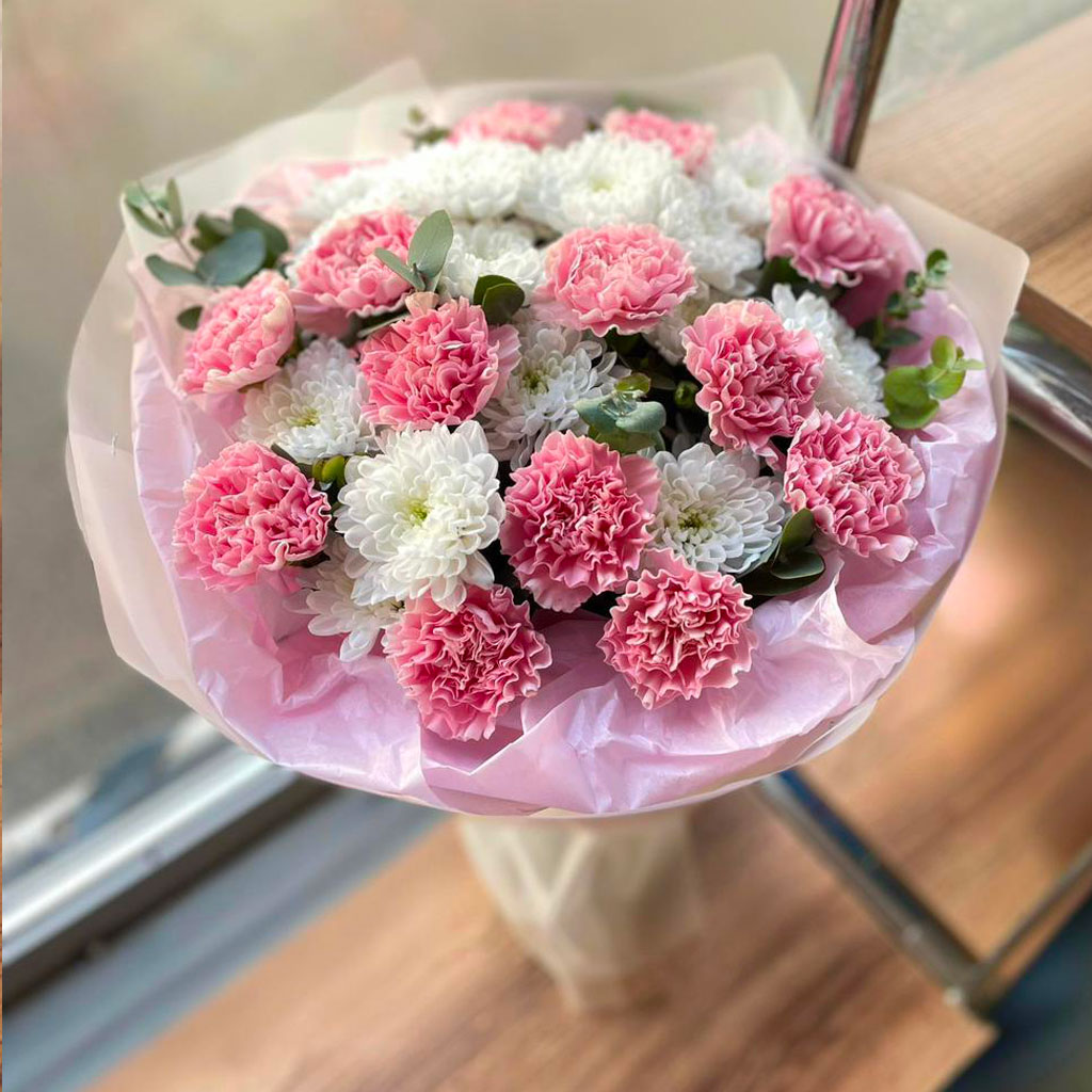На фото представлен возможный вариант сборки. Декоративное и цветовое оформление может меняться в зависимости от наличия цветов и упаковочных материалов. Мы соберем максимально похожую композицию с использованием сезонных цветов и декоративно-цветового оформления.