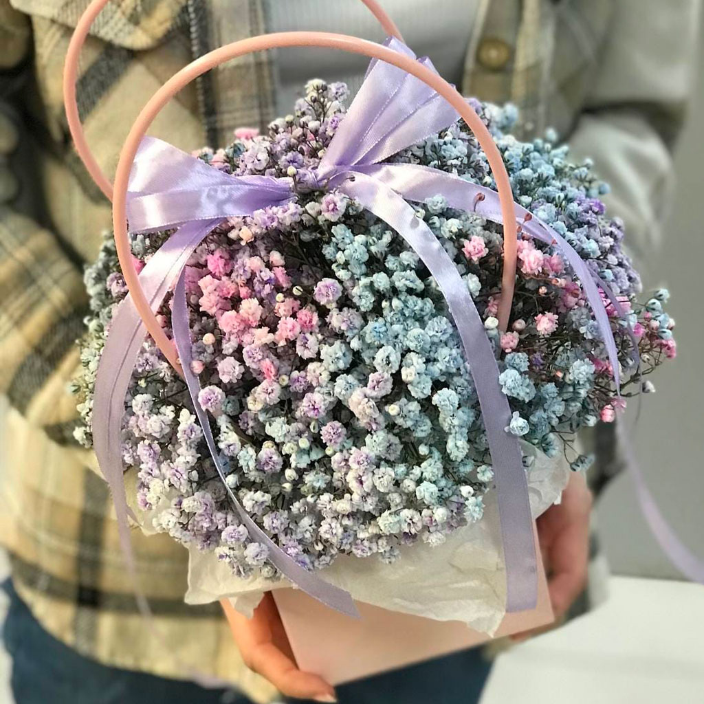 На фото представлен возможный вариант сборки. Декоративное и цветовое оформление может меняться в зависимости от наличия цветов и упаковочных материалов. Мы соберем максимально похожую композицию с использованием сезонных цветов и декоративно-цветового оформления.